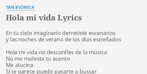En tu cielo imaginario derretiste escenarios, y las noches de verano de los días estrellados. С поточно предаване на музика в deezer можете да откриете над 56 милиона записа, да създавате собствени плейлисти и да споделяте любимите си записи с приятелите си. El número de espacios a rellenar depende del modo de juego o ejercicio seleccionado. Lyric video desarrollado para tan bionica. Hola mi vida , 03:32.